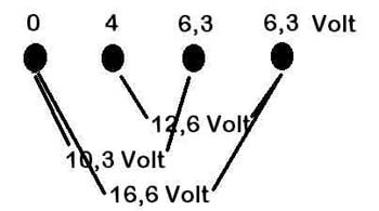 В лампах типа PCL86, имеющими накал 13 В, подают напряжения между клеммами 4 и 6,3 В, получает таким образом 12,6 вольт. Выпрямитель на напряжение 14 В точно его регенерирует.