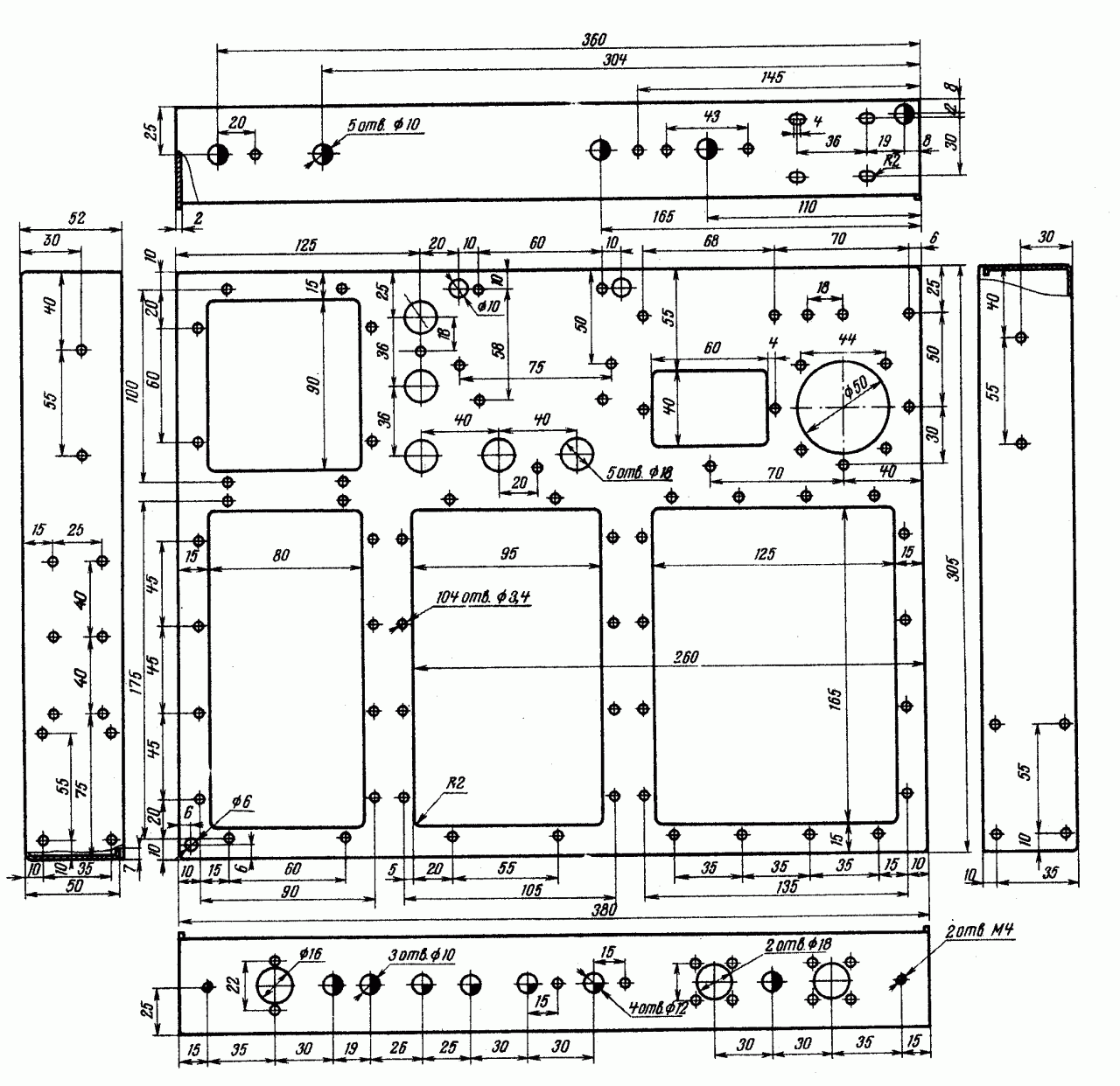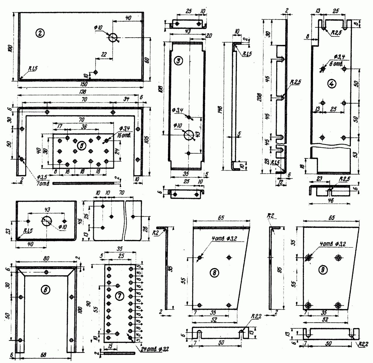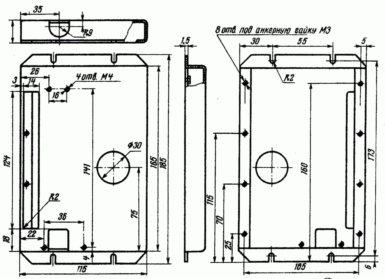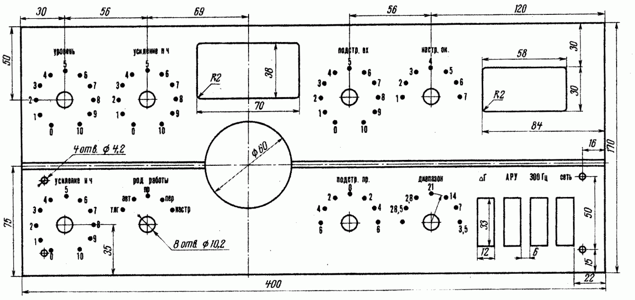 Трансивер собран на алюминиевом шасси, чертеж которого приведен на рис. 4. На рис. 5 дан чертеж передней панели, а на рис. 6 — отдельных деталей, используемых в конструкции трансивера. Общая компоновка детален видна на рис. 7 и 8 и фотографии общего вида.