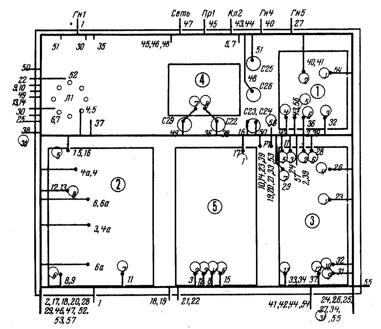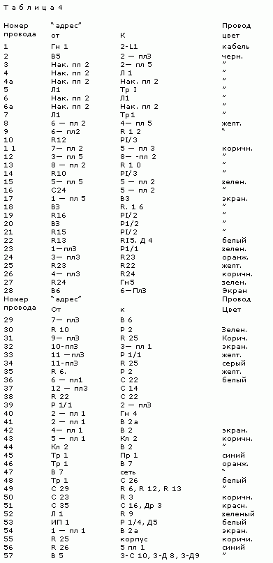 Платы соединены между собой и с остальными деталями проводами, объединенными в жгут. Чертеж жгута показан на рис. 14, а “адреса” входящих в него проводов приведены в табл 4. Некоторые короткие проводники в жгут не объединены.