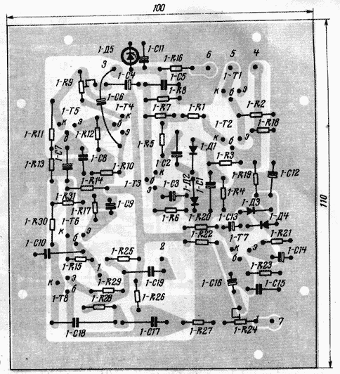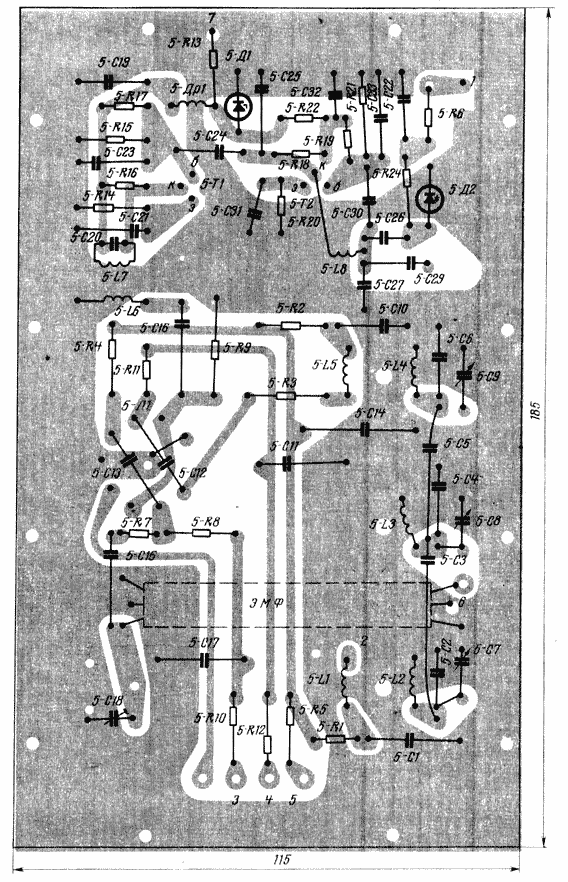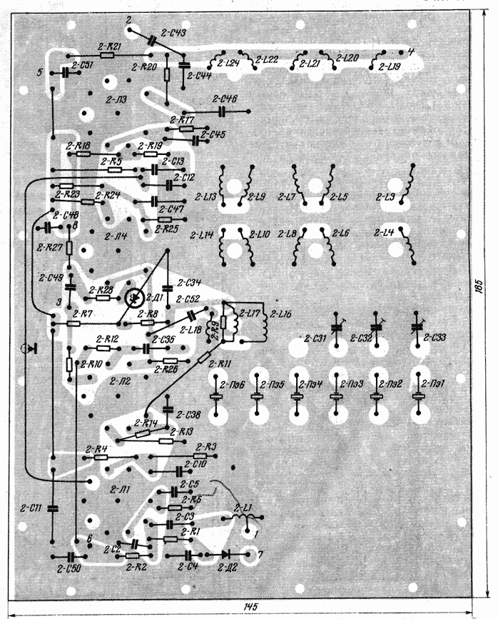 Плата 5 (рис. 13) - гибридная. Помимо двух транзисторов, работающих в гетеродине плавного диапазона, она содержит лампу — второй сместитель приемника и первый смеситель передатчика. Вначале .предполагалось разместить транзистор 5-Т2 непосредственно на плате. Однако довольно длинные соединительные провода между транзистором, катушкой 5-L8 и переменным конденсатором 5-С28 привели к некоторой (хотя и весьма незначительной) нестабильности частоты. Поэтому в окончательном варианте транзистор 5-Т2 и относящиеся к нему детали смонтированы в непосредственной близости от катушки 5-L8 в одном прямоугольном экране размером 50X70 и высотой 70 мм.