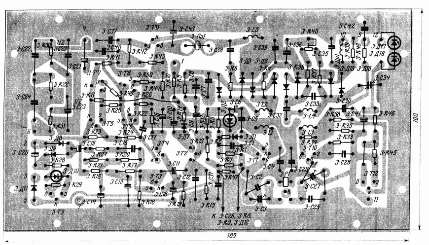 Плата 3 (рис. 11) объединяет усилители ПЧ и НЧ и детектор приемника, усилитель АРУ н второй кварцевый гетеродин. Кроме того, на ней находятся каскады, работающие в режиме передачи: усилитель ПЧ, балансный модулятор, усилитель ALC. На транзисторы 3-Т7,3-T4 усилителя НЧ необходимо надеть небольшие радиаторы, что улучшит условия охлаждения и повысит надежность работы, Резистор 3-R40 (СПО-0,5) необходимо тщательно проверить перед установкой, так как очень часто резисторы этого типа имеют ненадежный контакт между движком и резистивным слоем. Диоды бапансных модуляторов желательно подобрать по прямому и обратному сопротивлениям, однако модуляторы работают вполне удовлетворительно и без подбора диодов.
