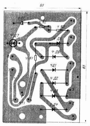 Плата 4 (рис. 12)—самая простая. На ней собраны выпрямители и стабилизатор напряжения. Транзистор 4-77 снабжен радиатором. Сильно нагревающийся резистор -1-R1 находится пне печатной платы.