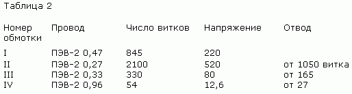 Силовой трансформатор собран на сердечнике ШЛ20Х40. Его данные приведены в табл. 2.