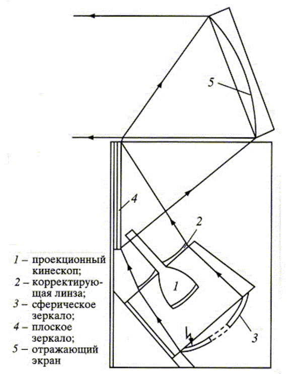 На проекционном кинескопе (1) с диаметром экрана 10 см воспроизводится изображение размером 5,6х7,5 см. Световой поток с этого экрана отбрасывается сферическим отражательным зеркалом (3), проходит через корректирующую линзу (2) на плоское зеркало (4), отражается от него и падает на отражающий экран (5) размером 38,1х50,8 см, находящийся в откидной крышке.