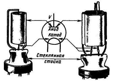 Любая электронная лампа, или, короче, радиолампа, представляет собой стальной, стеклянный или керамический баллон, внутри которого на металлических стойках укреплены электроды. Воздух из баллона лампы откачивают через небольшой отросток в нижней или верхней части баллона. Сильное разрежение воздуха внутри баллона - вакуум - непременное условие для работы радиолампы. В каждой радиолампе обязательно есть катод - отрицательный электрод, являющийся источником электронов в лампе, и анод - положительный электрод. Катодом может быть вольфрамовый волосок, подобный нити накала электролампочки, или металлический цилиндрик, подогреваемый нитью накала, а анодом - металлическая пластинка, а чаще коробочка, имеющая форму цилиндра или параллелепипеда. Вольфрамовую нить, выполняющую роль катода, называют также нитью накала. На схемах баллон лампы условно обозначают в виде окружности, катод - дужкой, вписанной в окружность, анод - короткой чертой, расположенной над катодом, а их выводы - линиями, выходящими за пределы окружности. Радиолампы, содержащие только катод и анод, называют двухэлектронными, или диодами. На (рис. 1) показано внутреннее устройство двух диодов разных конструкций лампа, изображенная справа, отличается тем, что ее катод (нить накала) напоминает перевернутую латинскую букву V, а анод имеет форму сплюснутого цилиндра. Электроды закреплены на проволочных стойках, впаянных в утолщенное донышко баллона. Стойки являются одновременно выводами электродов. Через специальную колодку с гнездами - ламповую панельку - электроды соединяют с другими деталями радиотехнического устройства.