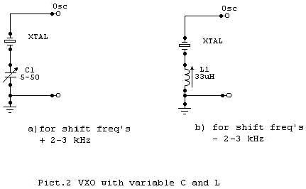 Где-то на страницах SPRAT мне попадался материал, где описывался вариант «увода» частоты кварца вверх и вниз с помощью одновременно последовательно включенных катушки индуктивности и КПЕ. К сожалению, все мои старания с подбором необходимой для этого индуктивности ни к чему не привели. Конденсатор последовательно с xtal может дать Вам частотный сдвиг приблизительно 2-3 кГц вверх от основной частоты кварца, а индуктивность - 1,5- 2 кГц вниз. Обычно, я использую переменный конденсатор от 5 до 50 pF и могу сдвигать 14060 кГц xtal к 14070 кГц без проблем. Между прочим, этот метод дает мне, возможность использовать 20 м версию “Микро-80” для приема станций PSK31 на 14070 кГц. Вы можете пробовать это также, и я уверен, что вы будете иметь большое удовольствие!